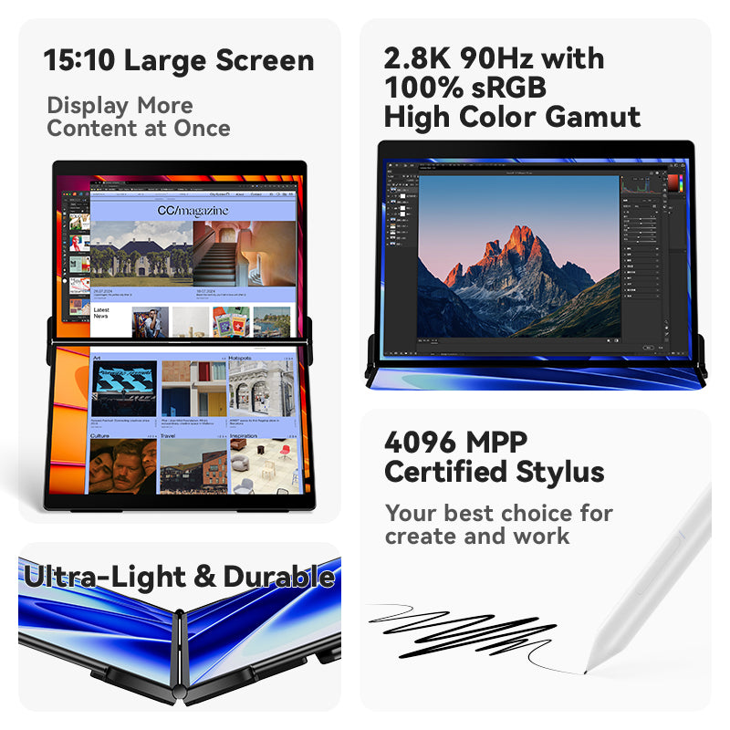 - Dual 14.2" 2K Displays: 15:10 Golden Ratio + 90Hz Refresh Rate – 40% more vertical space for coding/design vs. 16:9 screens, zero motion blur.